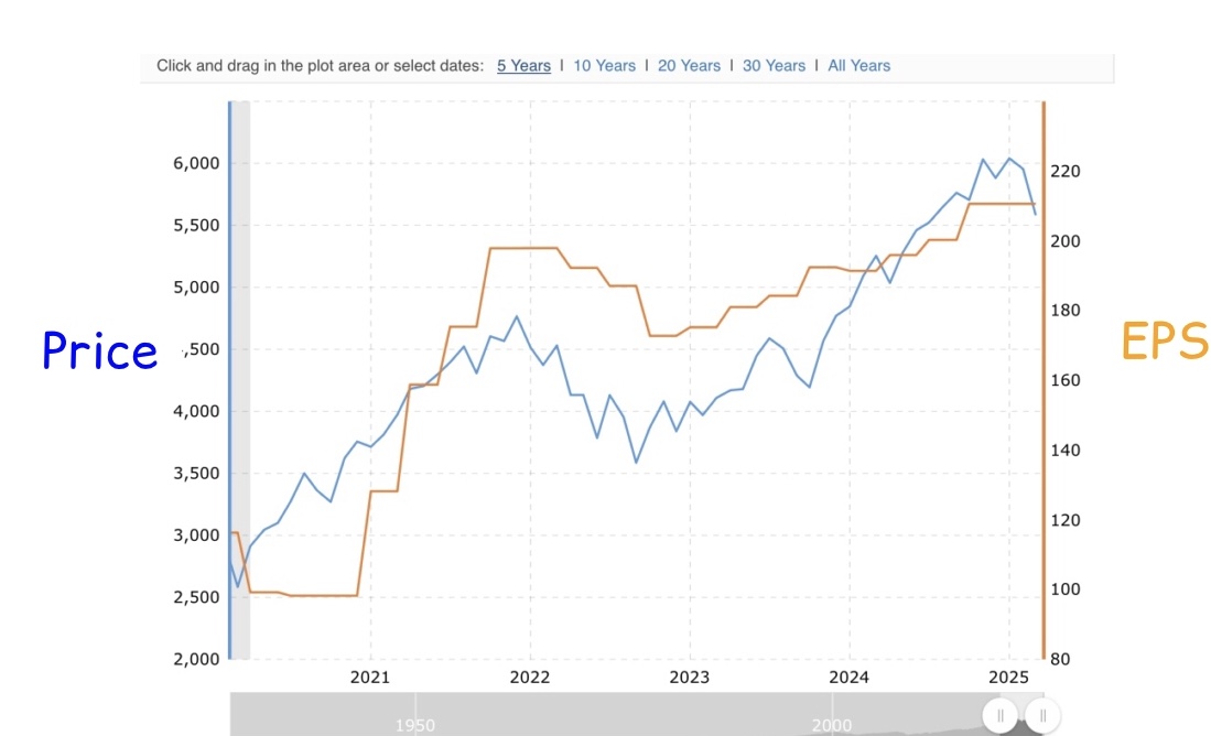 - Current, S&P500 are fairly valued as the earning line and the S&P500 price matches.