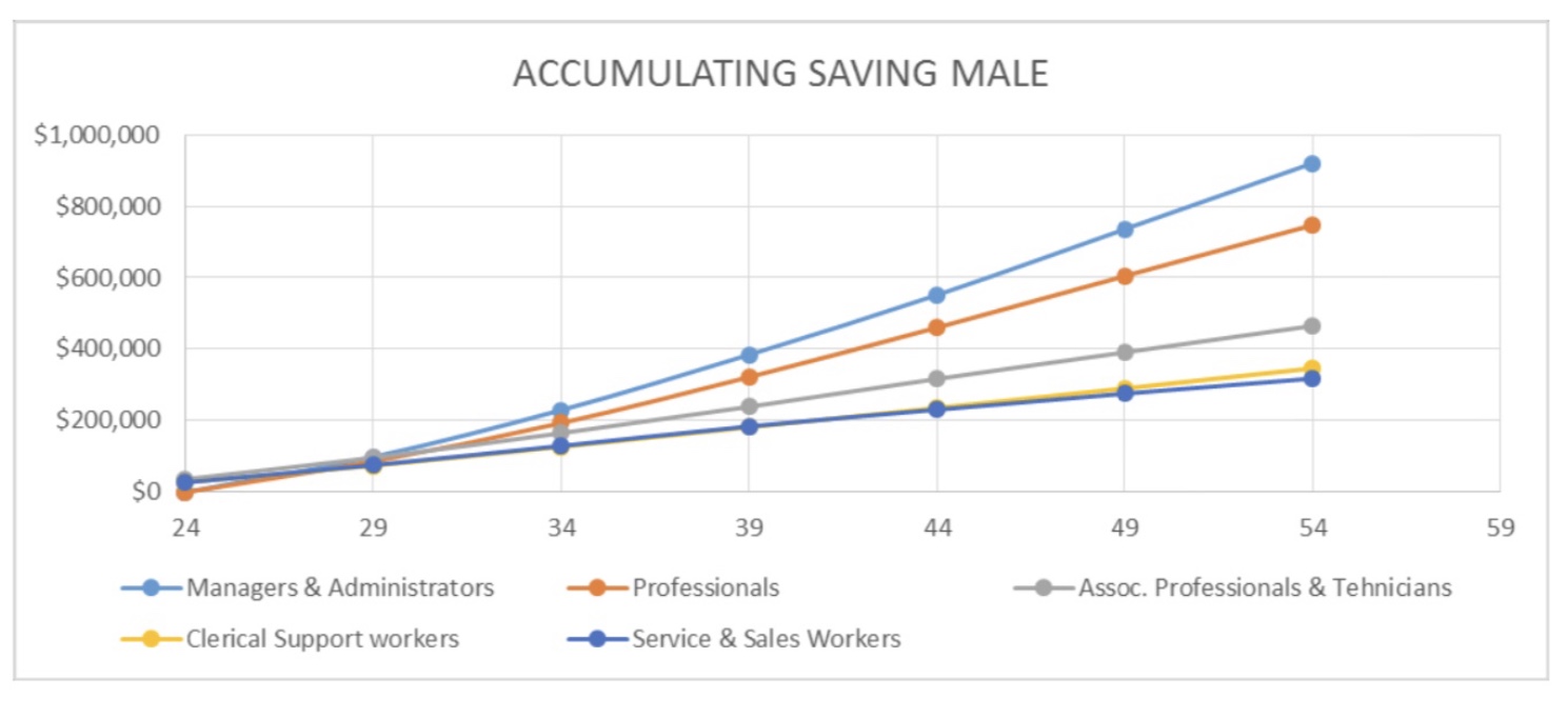 - A more possible target net worth will be ~$600k by 40 for a lower income- service & sales workers (Right Table)