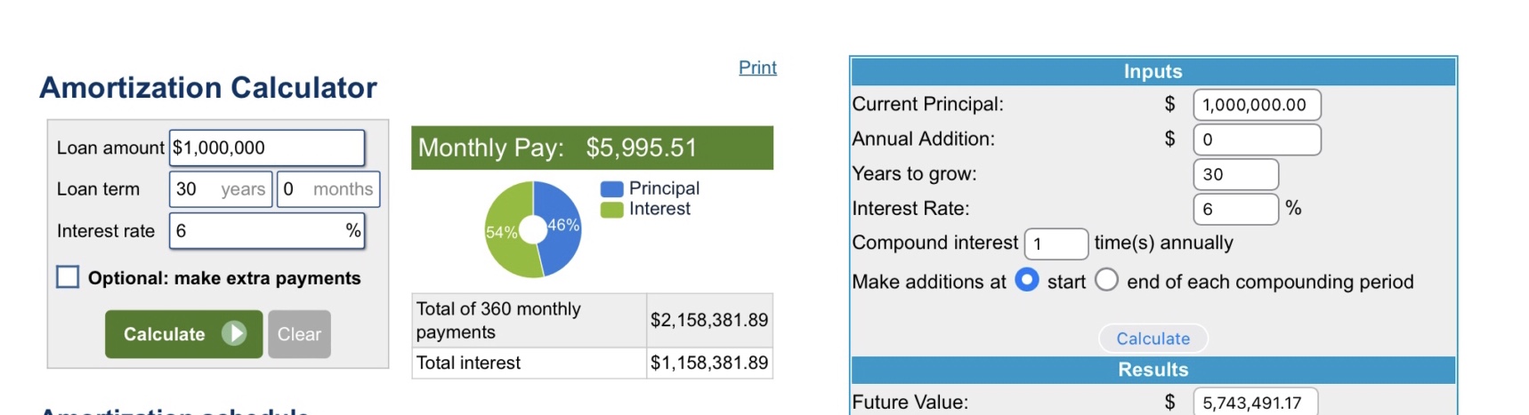 - For example, if we have $1 million in cash and a $1 million mortgage for 30 years at a 6% interest rate, we would pay approximately $1.15 million in interest over the life of the loan.