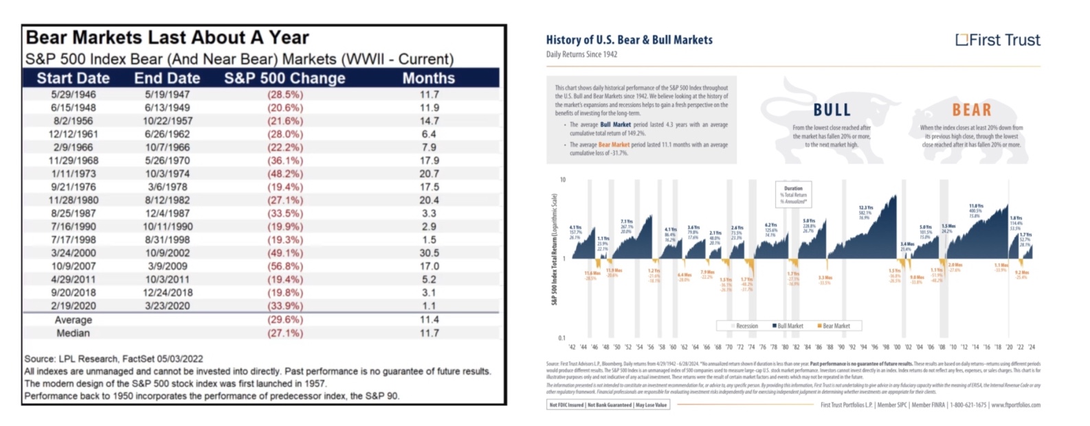 - Historically, bear markets have typically lasted for 11 months, while bull markets have averaged 4 years.