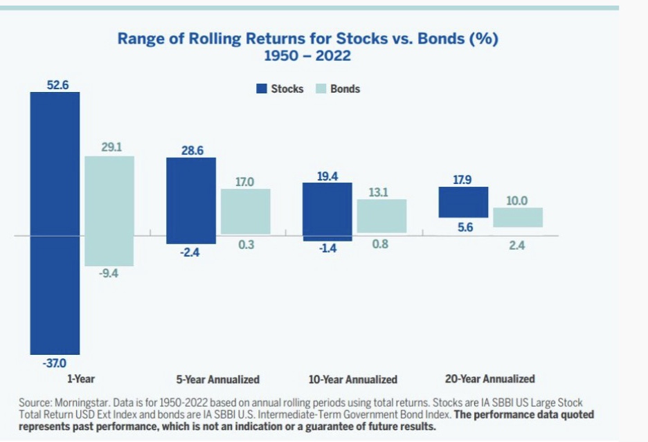 - In a single year, stocks can experience significant fluctuations, with a best-case scenario of a +52.6% return and a worst-case scenario of a -37% loss.