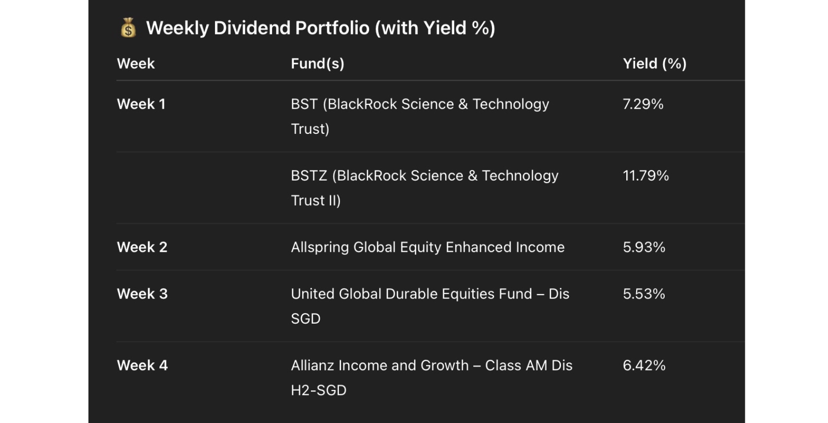 - I’m currently looking for a suitable SGD-denominated global equity fund that pays monthly dividends on the first week to replace BST & BSTZ, as both are subject to a 30% dividend withholding tax and FX risk.