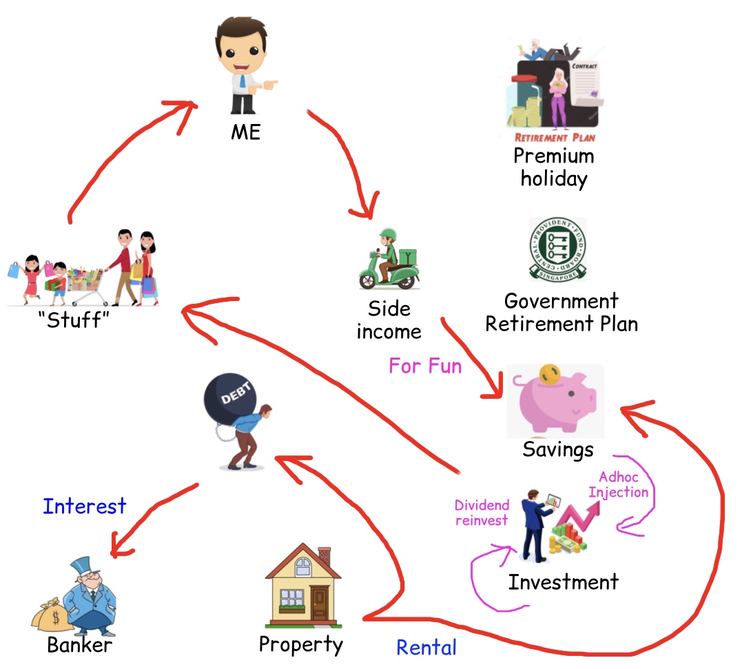 We recieve our salary ➡️ 20% is pre-deducted to CPF ➡️ pay insurance companies ➡️ pay car loan, mortgage loan ➡️ if cash is not enough, CPF will help to pay mortgage ➡️ then we use credit cards to buy "stuff" ➡️ Go back to work to earn money to pay for the debt.