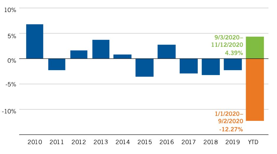 We are optimistic about the long-term return potential of equities and expect to see opportunities arise for investment in undervalued stocks during 2021, depending on how quickly and effectively global governments can deal with the ongoing COVID-19 pandemic. The so-called FAANG stocks (Facebook, Apple, Amazon, Netflix and Alphabet) saw robust performance throughout last summer, contributing to a situation in which the 10 largest companies listed on the S&P 500 Index made up more than 25% of its market capitalization.1 Gains have begun to slow, as demonstrated by the S&P 500 Equal Weight Index, which outperformed the broad S&P 500 Index (based on free-float market capitalization) during October and November. This suggests a price correction, if not a full-scale rotation. (Past performance is not an indicator or a guarantee of future performance.)