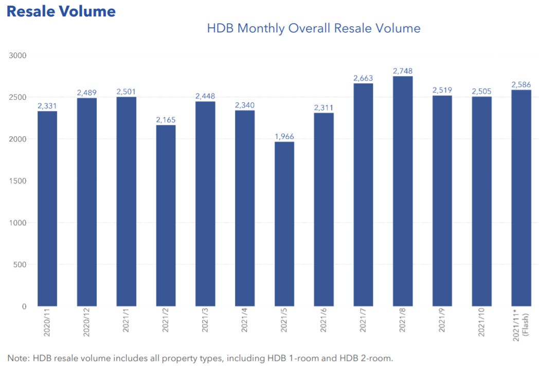This resulted in a rise in resale prices and transaction volumes. From the table below, HDB’s Monthly overall resale volume hit a high of 2,748 units in August and has since declined slightly to 2,586 units in November.