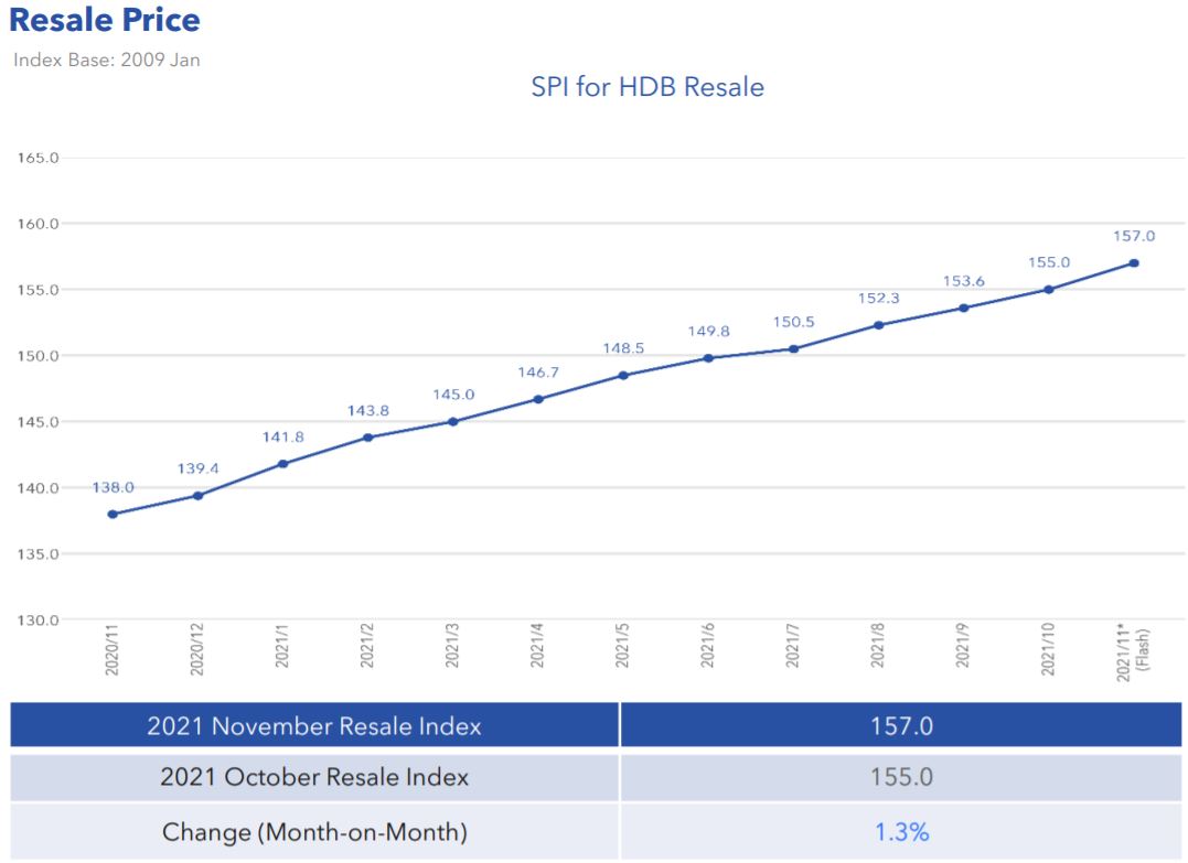 Despite the fluctuating resale volume, resale prices have been on a steady upward trend. From the table below, we started off the year with the Singapore Property Index (“SPI”) at just 141.8. Coming into November, the index has risen to a record high of 157.0.
