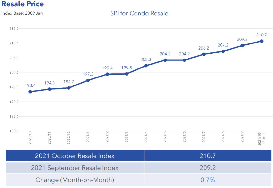 On the non-landed property front, similar trends are also exhibited in terms of volume and resale price. The index started off the year at just 197.7 and rose to a high of 210.7 in October.