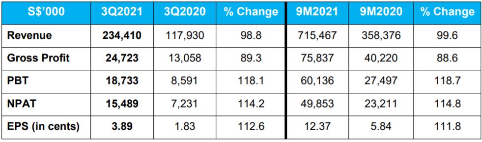 For 9M FY2021, both PropNex’s revenue and NPAT shot up by close to 100% and 115% respectively on back of the strong sentiment in the property market.