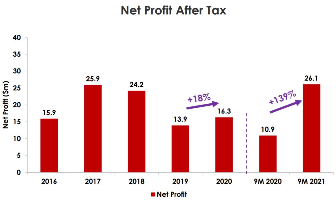 As a result of the surge in its topline, APAC Realty’s net profit after tax jumped by close to 140% year-on-year to S$26.1 million. To put things into perspective, it's 9M FY2021 net profit after tax already exceeded its FY2017’s net profit after tax of S$25.9 million.