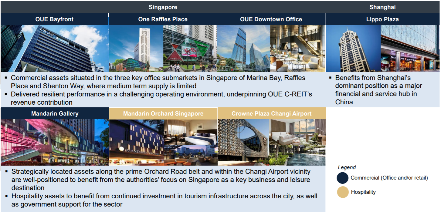 OUE C-REIT completed the merger with OUE Hospitality Trust in September 2019 to become one of the largest diversified REITs with total assets of S$6.8 billion. With seven properties across the commercial and hospitality segments in Singapore and Shanghai, OUE C-REIT’s property portfolio comprises approximately 2.2 million sq ft of prime office and retail space, and 1,640 upscale hotel rooms.