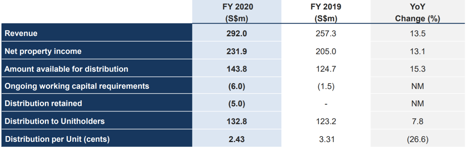 Meanwhile, distributable income grew by 1.4% year-on-year to S$27.5 million. The slower growth in distributable income was mainly due to a higher property expenses, as a result of the provision of doubtful debts amid the impact of COVID-19.