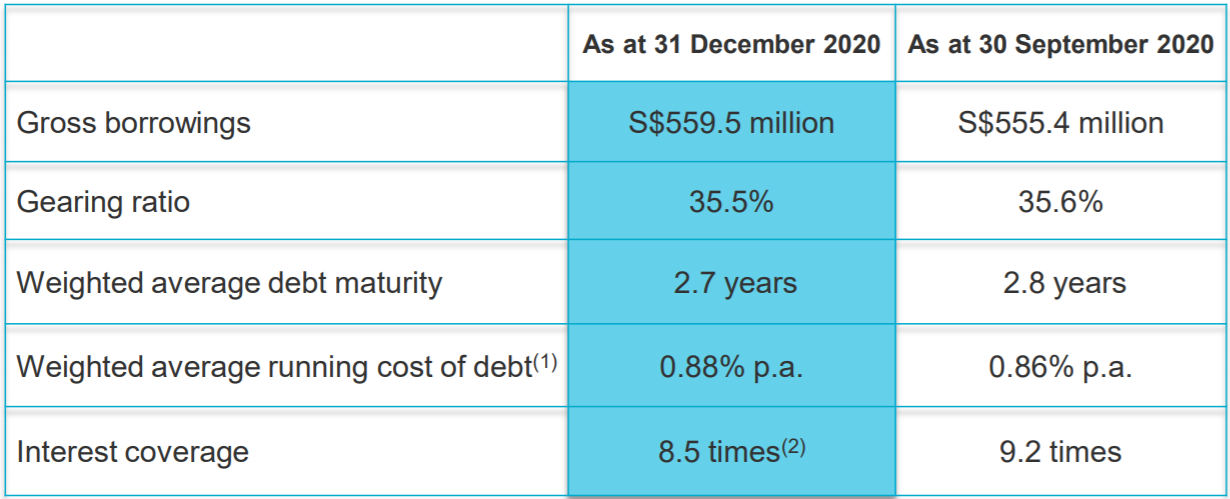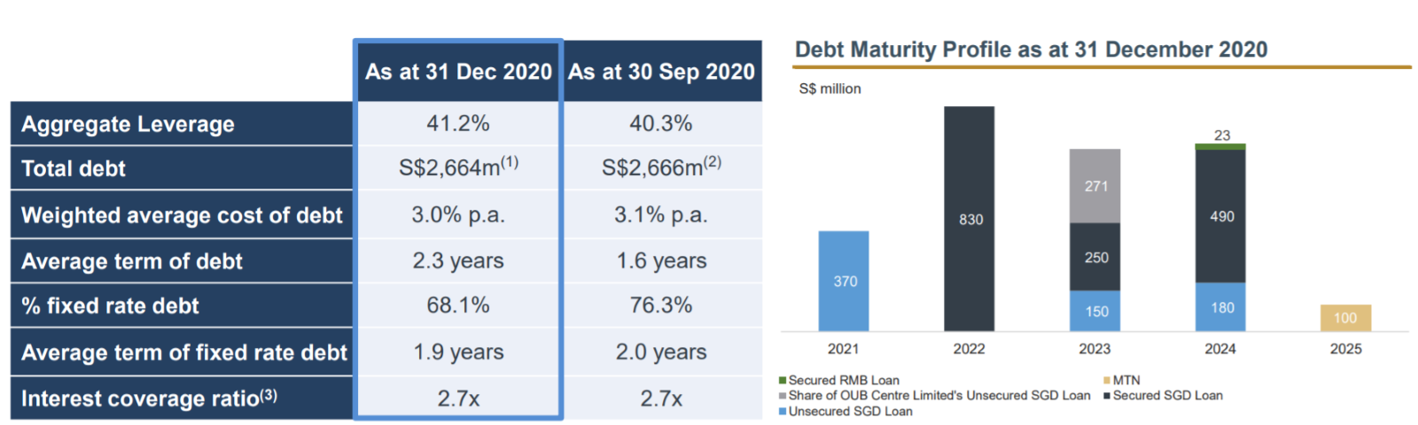 For the rest of 2021, there are only 14% of debts (S$51.8 million) that are due for refinancing. The average term of debt increased to 2.3 years as at 31 December 2020. The next refinancing hurdle will occur in 2022, where a S$830 million Secured SGD loan will be due for refinancing.