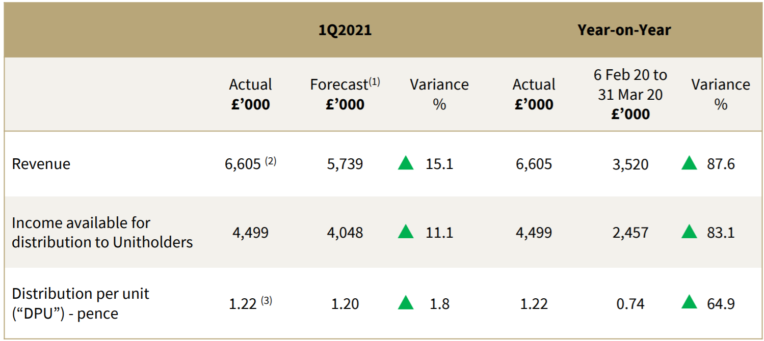 However, with the issuance of new units for the above acquisition, this resulted in the slower growth in terms of distribution. The distribution per unit stood at 1.22 pence for 1Q FY2021, 1.8% higher than the forecasted figure in the IPO prospectus and 64.9% higher year-on-year.