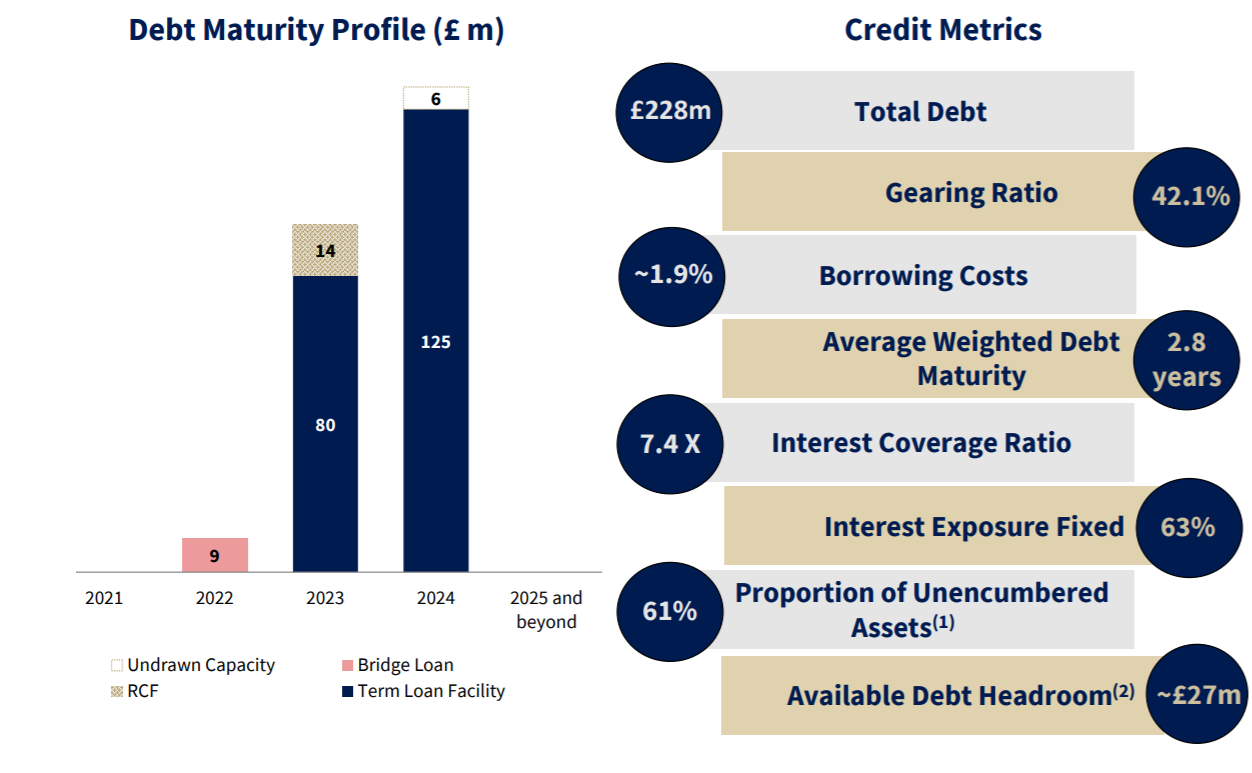 Most of the maturing debts will be due for refinancing in both FY2023 and FY2024, with term loan facility worth £80 million and £125 million respectively.