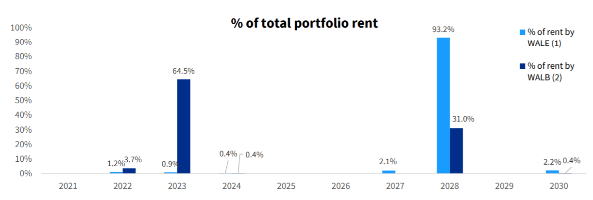 In terms of the REIT’s weighted average lease expiry (“WALE”) (Light Blue Bar), there are only minimal amount of lease that are due to expire in FY2022 - FY2024 and FY2027. Most of the lease expiry will occur in FY2028, where 93.2% of the leases will expire by then.
