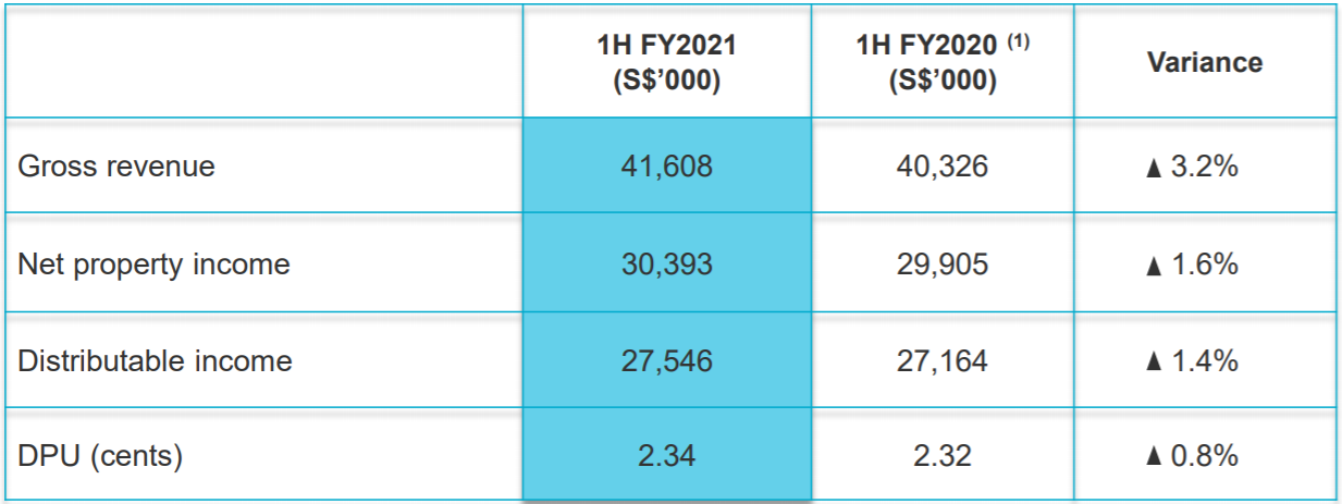 For 1H FY2021, the REIT’s gross revenue grew by 3.2% year-on-year to S$41.6 million. This was driven by the strengthening of the Euro against the Singapore Dollar for Sky Complex as well as improved operational efficiency to reduce costs and conserve cash at 313 somerset.