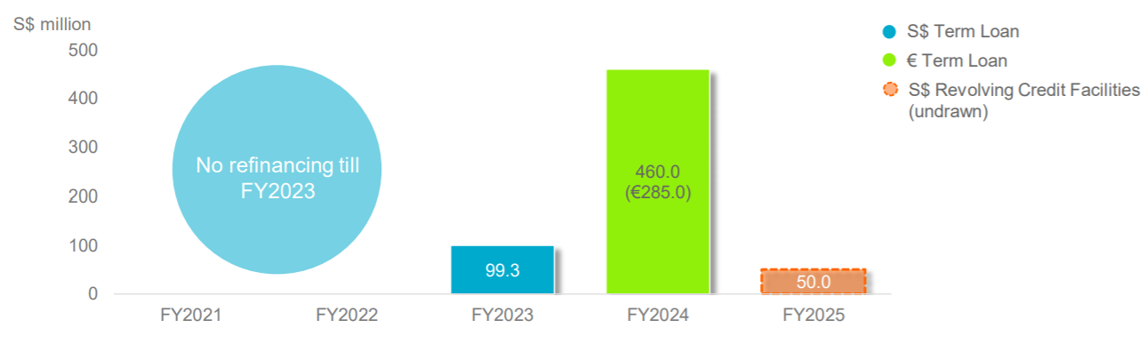 Meanwhile, there will be a S$99.3 million term loan that is due for refinancing in FY2023. Subsequently, the major refinancing hurdle will be in FY2024, where a €285.0 million term loan will be due for refinancing.