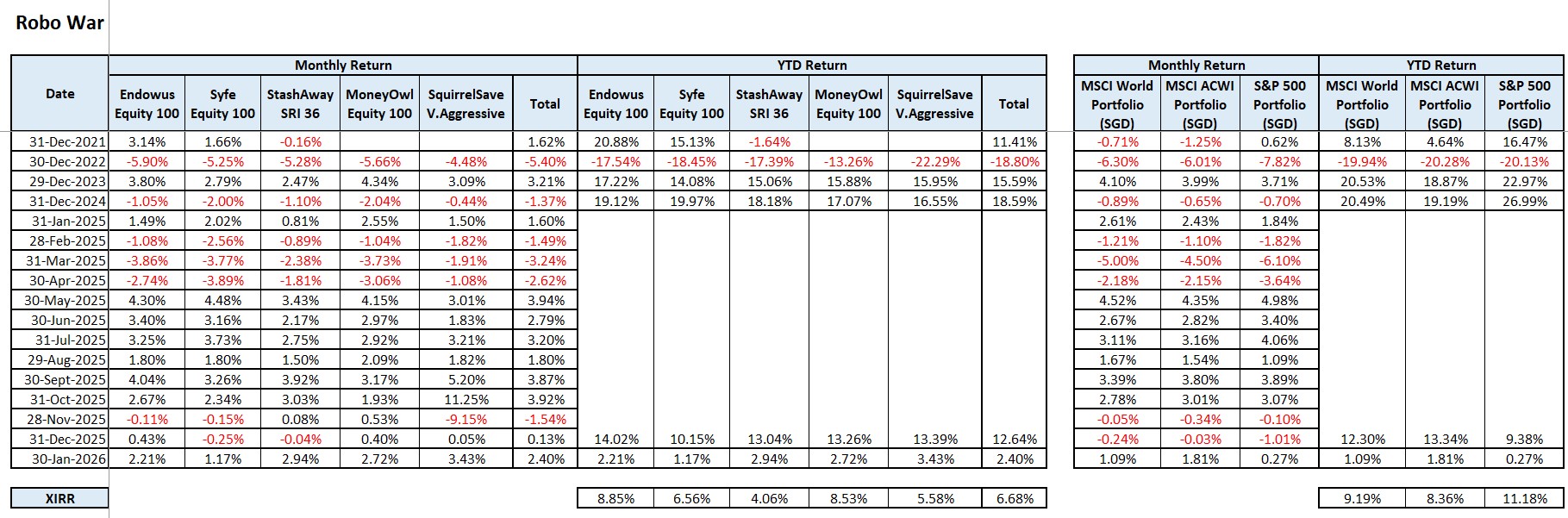 All 5 robo advisor portfolios and all 3 benchmark indices turned in positive monthly returns in January 2026. SqSave portfolio took the top spot at 3.43% among the robo advisors.