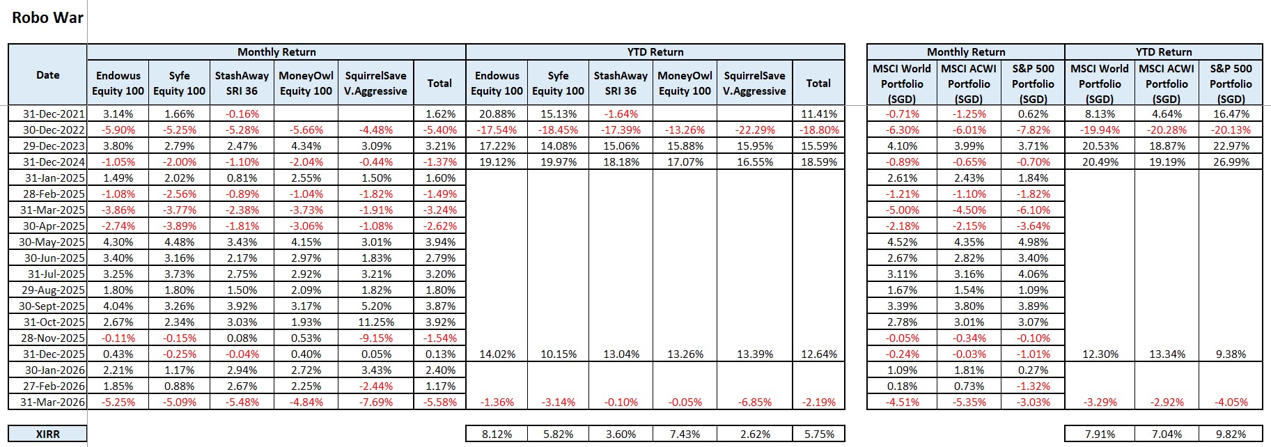 An update to my Robo War Experiment performance for March 2026.