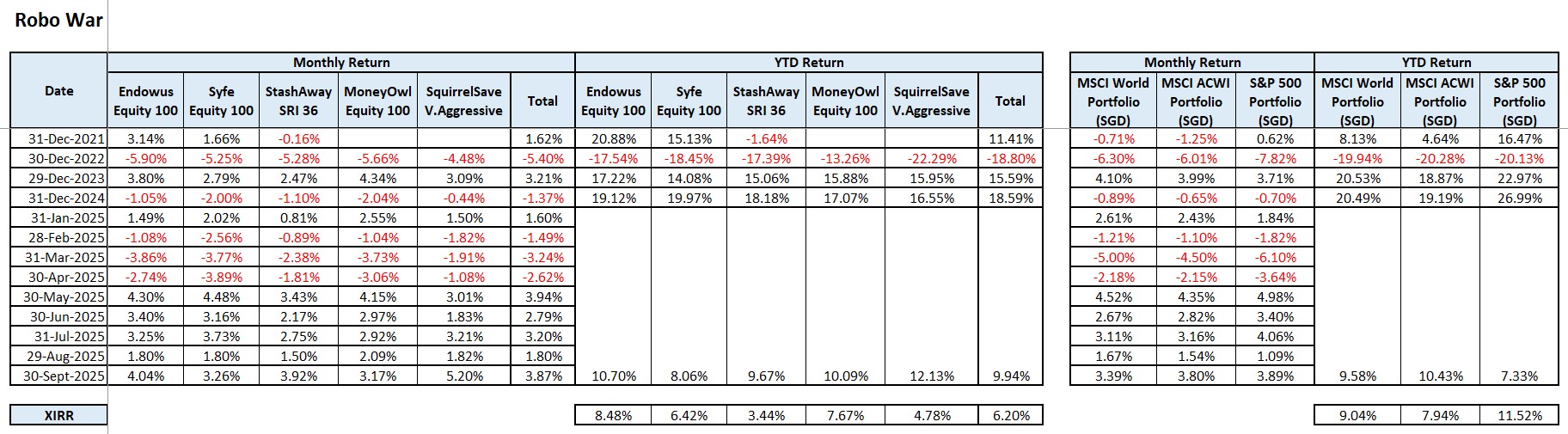 All 5 robo advisor portfolios and 3 benchmark indices had more than 3% monthly returns in September 2025. All their YTD Returns and XIRR since inception had improved compared with that of August 2025.