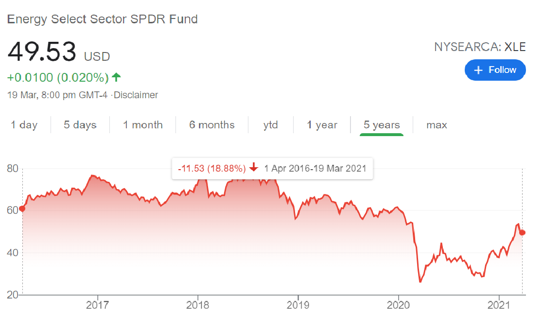 Sectors that don’t do well, such as those that are falling out of favour or those of sunset industries will, as expected, not perform as new and booming sectors. One fine example would be the oil industry, which has been taking a huge beating. The Energy Select Sector SPDR Fund (NYSE: XLE) was down more than 57% in the Covid-19 crash and is still down around 18.88% since 5 years ago!