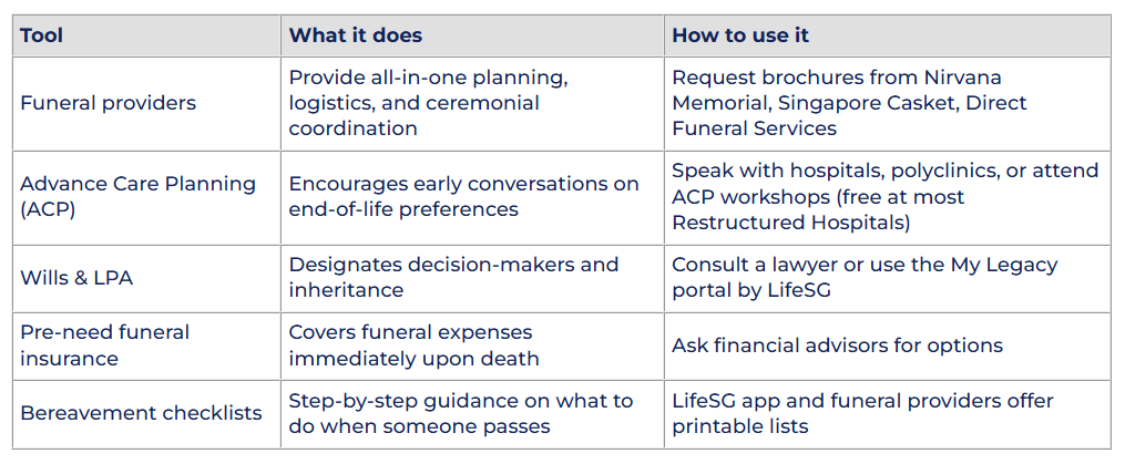 Some seniors prepay for funeral services through providers such as Nirvana Memorial Garden or Singapore Casket. These packages often include everything from the casket to catering. Prepayment removes the burden from children but may be expensive or unsuitable for some families.