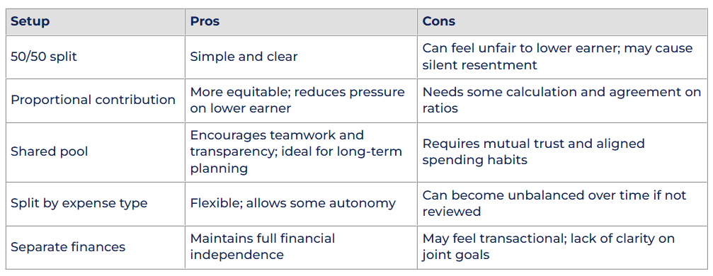 When you and your partner bring in different incomes, it helps to align on a framework for managing shared expenses. Here are some of the most common financial arrangements couples use, especially in dual-income households: