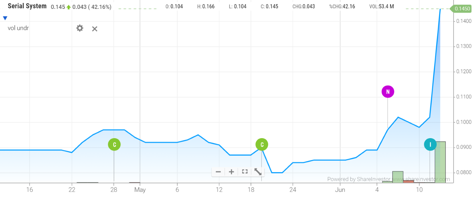 Serial System surged 43% (14 June) on heavy volume; this happened a week after the company unveiled its strong set of 1Q