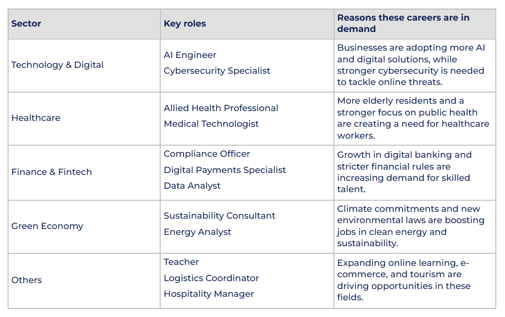 Singapore is accelerating its shift towards sustainability. Careers such as sustainability consultant, environmental analyst, and green finance manager are becoming more common.