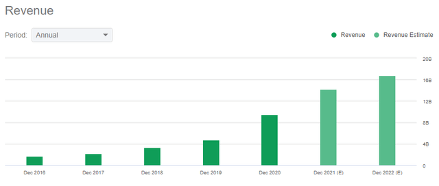 Square’s revenue more than doubled last year as the pandemic took hold and accelerated Square’s adoption among consumers and small businesses in particular. Square is expected to add more than $4 billion in revenue this year and another ~$2.5 billion next year.