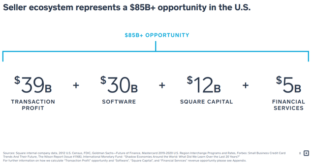 Square believes the Seller business has a total addressable market of $85 billion today, which should only grow over time. As the economy grows, this pot should get bigger and bigger, allowing not only Square to grow but also its competitors. This is the best kind of market to buy into for investors because everyone in the same market can win.