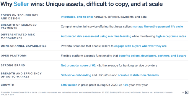 Another important element is the powerful moat of network effects. While competitors can wholesale copy Square’s ideas, they simply do not have the large extensive network of buyers and sellers which Square created to effectively turn the business into a network, and switching cost are extremely high for both merchants and consumers should they make a switch.