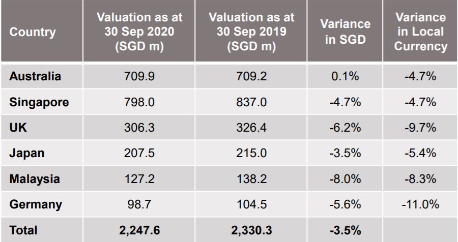 The next largest contribution comes from Australia, which has Novotel Melbourne on Collins, Novotel Sydney Darling Square, Sofitel Sydney Wentworth, Fraser Suites Sydney under the Trust. Due to a favourable exchange rate, the total valuation came in at S$709.9 million, which is a slight increase of 0.1% year-on-year. However, in terms of the local currency, the Australian Dollar, the valuation of its Australian segment suffered a drop of 4.7% year-on-year.