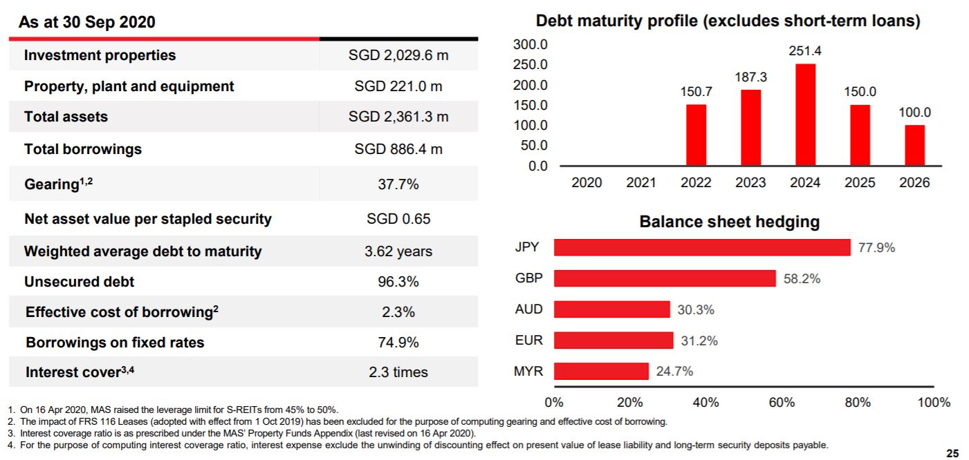 As of 30 September 2020, FHT’s aggregate gearing ratio stands at 37.7%, which is below MAS’s stipulated gearing ratio limit of 50%. For FHT’s debt maturity profile, there are no refinancing needs in 2020 and 2021 and the next financing hurdle will be in 2022 where S$150.7 million worth of debt will be due for repayment.