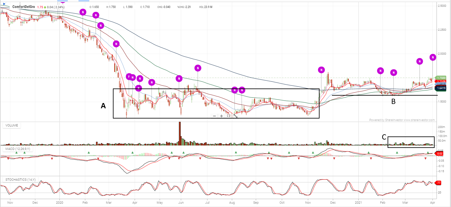 Seng Foo: The share price of ComfortDelgro fell from a pre-COVID level of around $2.40 in January 2020 to a low of $1.33 in March 2020. Since then, the price had been languishing within a trading range (A), until it broke above in November.