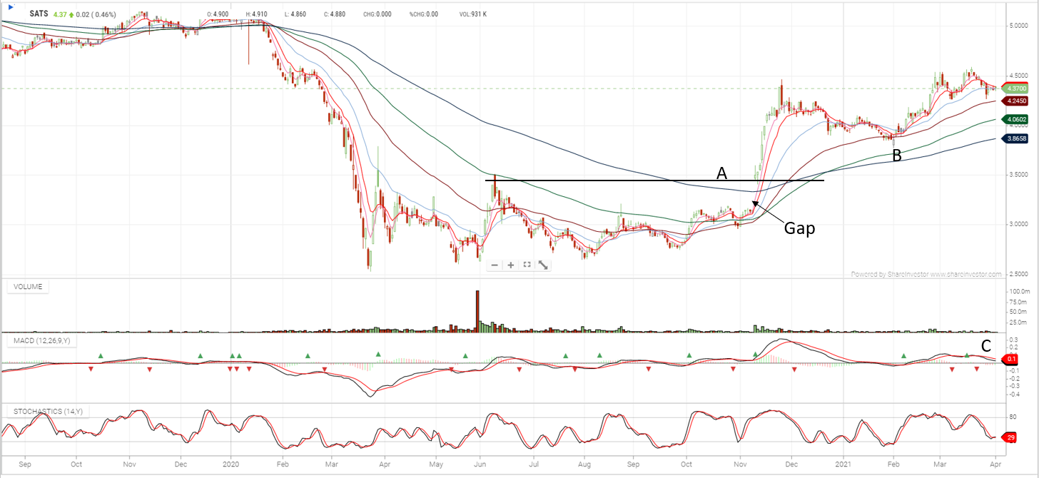 Seng Foo: In Nov 2020, the price gapped above the resistance zone at $3.40 (A) on news of STAS announcing its capability to transport the COVID-19 vaccine developed by Pfizer, which has to be kept at -70 degrees celsius during transit.