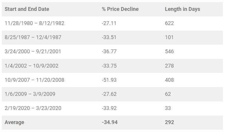 Bear markets tend to be short-lived. The average length of a bear market since 1980 is 292 days, or about 9.7 months. This is significantly shorter than the length of a bull market, which is 991 days, or 2.7 years.