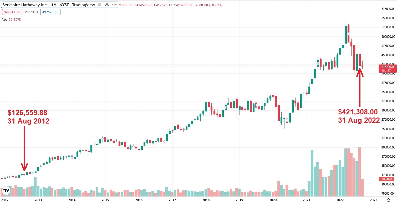 Based on these prices, we can compute the CAGR of BRK.A to be (421308/126559.88)^(1/10)-1 = +12.8% p.a. One would realize from the formula that CAGR would be different if we compute based on different beginning and final values across different periods with different number of years in between.