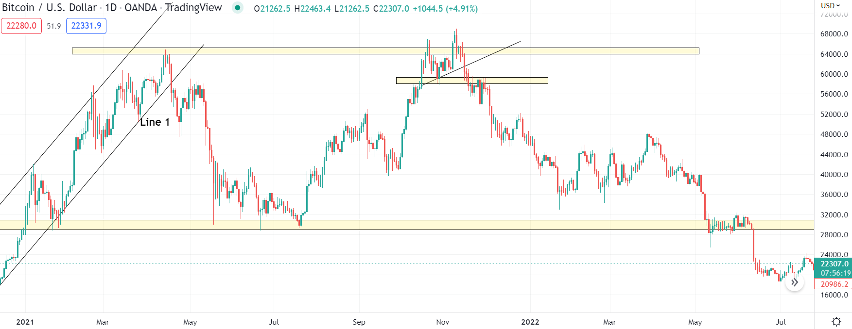 There are many tools in the world of technical analysis that can help know when to exit an investment. They include hundreds of indicators, trendlines, and many more. For simplicity, I will be using only support, resistance, and trendline to analyze the crash of Bitcoin last year.