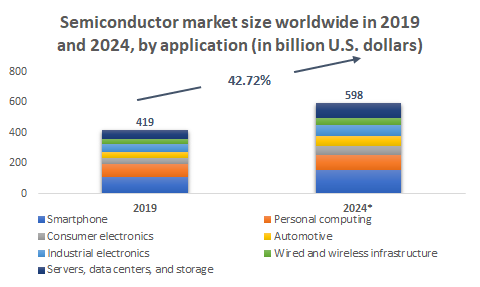 Moving forward, the semiconductor industry has an upside potential given the increased demand due to the demand in various technological advancements such as the Internet of Things (IoT) and automotive. We are expecting an approximately 42.72% growth within 5 years from 2019–2024(figure 1). _The current global semiconductor revenue forecast is also expected to grow 19.7% in 2021 and 8.8% in 2022(_figure 2). The semiconductor has seen a conservative 5.02% compound annual growth rate between 2012–2020 (Figure 3).