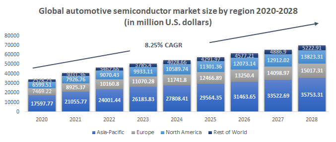 Automotive is expected to see a compounded annual growth rate from 2020–2028 globally (figure 8). As countries globally move towards zero carbon footprint, the adoption of hybrid and electric vehicles is forecasted to increase in the next decade. Such cars require about 2 times the semiconductor component as compared to conventional cars. Purposes of the semiconductors are used for powertrains, next-generation chassis, safety systems and sensor functions.