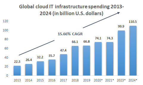 Cloud computing has become increasingly common among various industries given the current pandemic situation as companies migrate their operations online. This has translated to an increase in demand for cloud infrastructure pushing growth for server CPUs and storage. Cloud infrastructure is expected to have a 15.66% compound annual growth rate (figure 9).