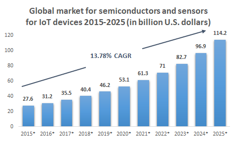 Lastly, the increased popularity of the Internet of Things (IoT) as countries transit into a smart city, has driven the demand for semiconductors up. We are expecting to see a 13.78% compounded annual growth rate (figure 10) on the conservative side and the overall types (figure 11) moving forward. The growth outlook is backed by the technological advancement in sensors, more efficient computing power and increased reliability in connectivity.