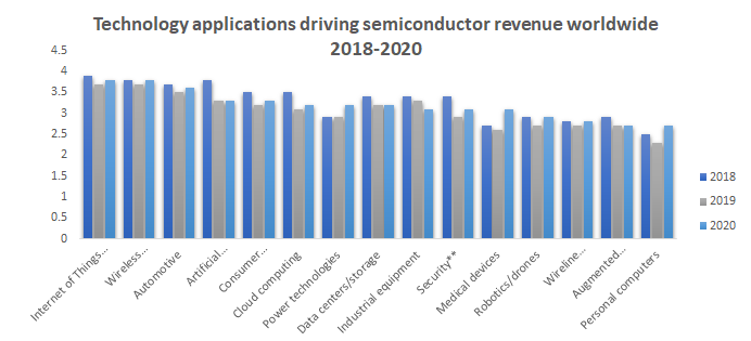 Based on recent studies from KPMG; GSA, we are able to identify the key applications for the semiconductor industry (figure 12). Data is interpreted as such: 1 = not important at all and 5 = very important.