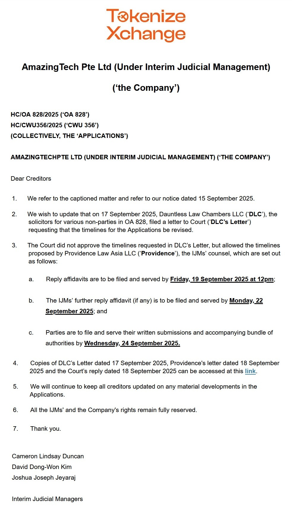 Today (18 September 2025) at 8:06pm received another email from the Interim Judicial Managers (IJMs) of AmazingTech Ptd Ltd, the operator of Tokenize Exchange: