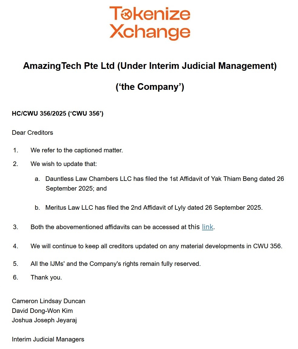 Last night (26 September 2025) at 10:06pm, the Interim Judicial Managers (IJMs) of AmazingTech Ptd Ltd sent an email giving an update on the follow-up filings of IJM solicitor as well as another solicitor with regards to CWU 356 (liquidation application):