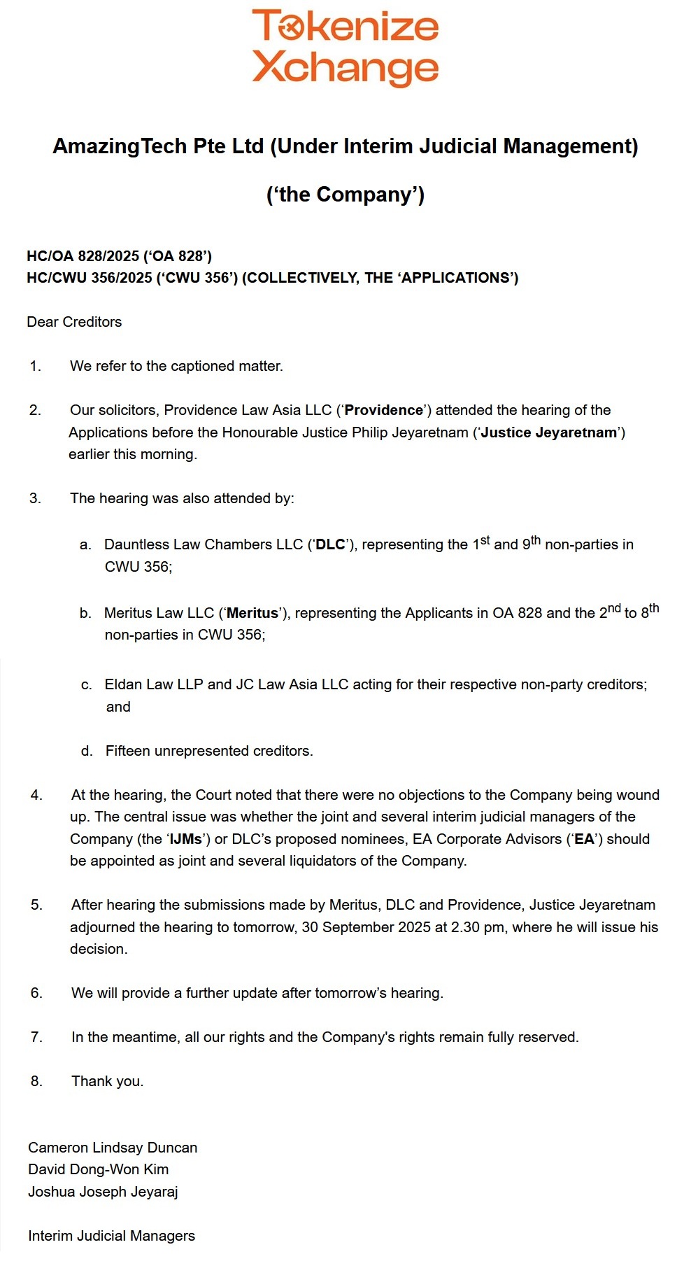 Yesterday (29 September 2025) at 5:40pm, the Interim Judicial Managers (IJMs) of AmazingTech Ptd Ltd sent an email giving an update on the 10am hearings with regards to OA 828 (judicial management) and CWU 356 (liquidation application):