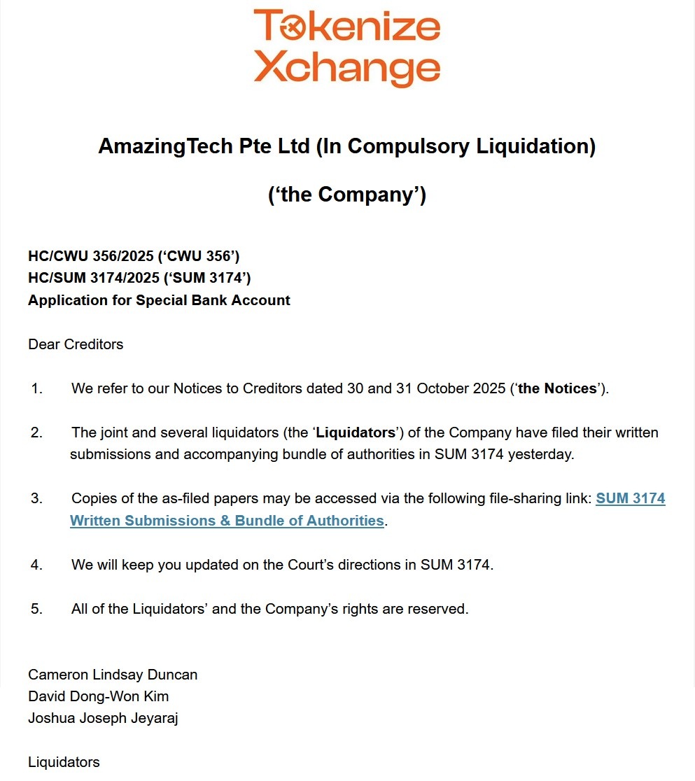 This update simply informed the Creditors that the Liquidators have filed their written submissions and accompanying bundle of authorities in SUM 3174 on 11 November 2025 according to the proposed and approved timeline for Application for Special Bank Account as updated in the notices dated 30 and 31 October 2025 (refer to the blog post Tokenize Exchange Liquidator Update on 30 & 31 October 2025 for details).