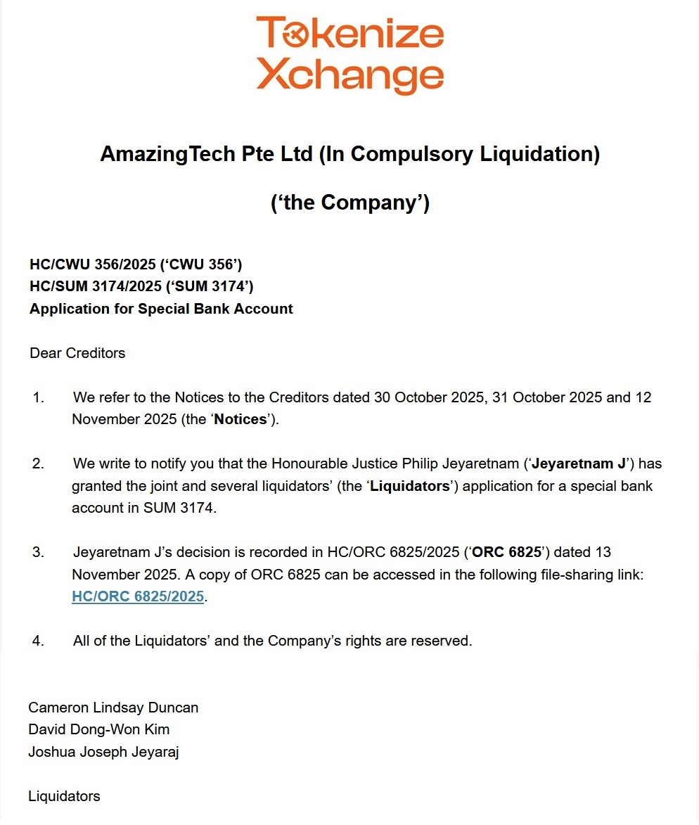 As mentioned in the previous Liquidator Update (refer to the blog post titled Tokenize Exchange Liquidator Update on 12 November 2025), the hearing for the Application of a Special Bank Account in SUM 3174 was scheduled to be on 13 November 2025 at 10am.