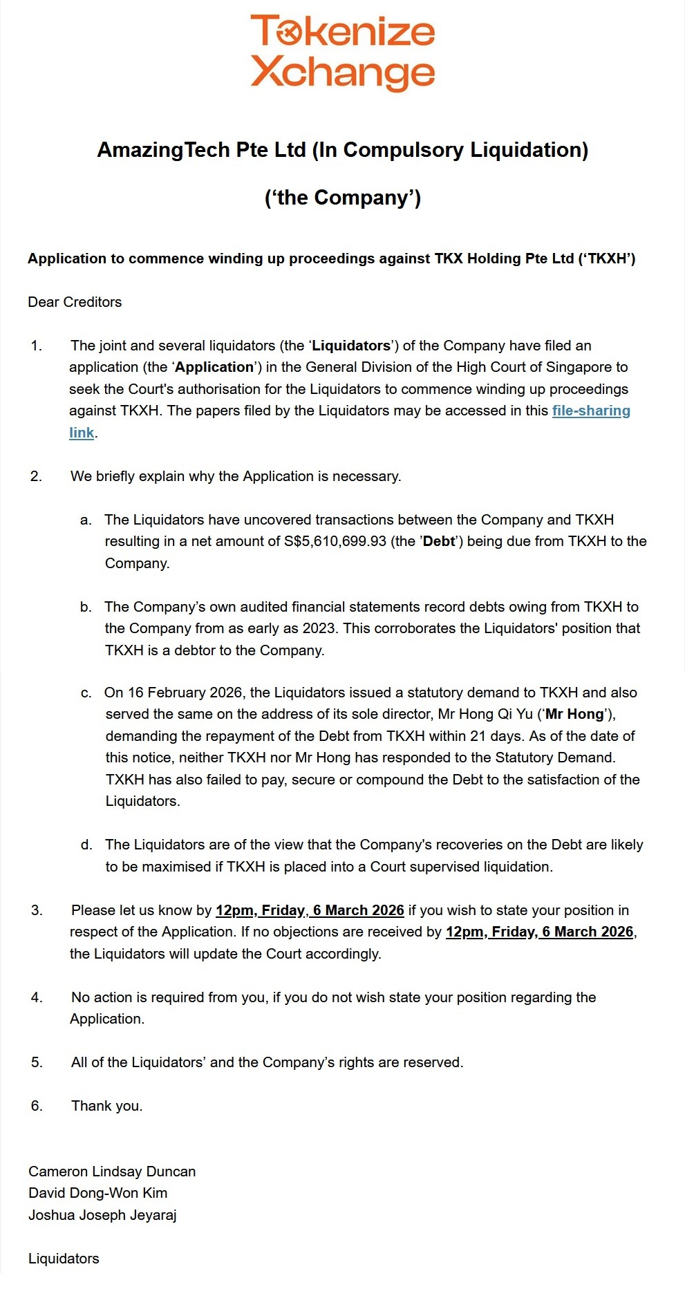 So the Liquidators had issued a statutory demand on 16 Februray 2026 demanding TKXH and Hong Qi Yu (CEO of Tokenize Exchange) to pay back the debt within 21 days. Both parties haven't responded to the demand as of the date of this notice.